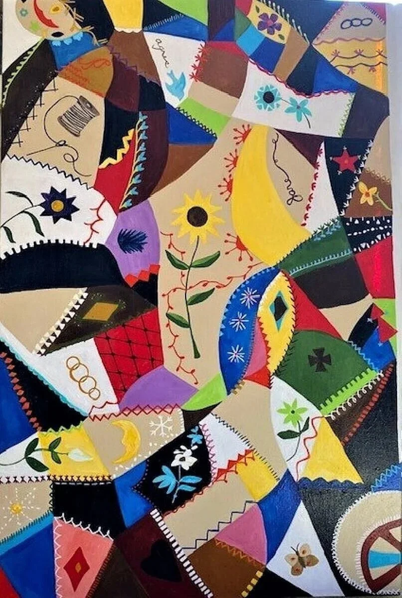 This painting is called “the way” (20 x 20” acrylic on canvas). It was inspired by patterns and designs that were encoded in quilts, which were displayed on clotheslines, window sills, and porches to help enslaved Blacks as they navigated the Underground Railroad to freedom. The “drunkard’s path,” here rendered in blue, was a signal to zigzag in order to avoid dogs. The log cabin in green, orange, and print would indicate a safe place to shelter. tess (2022)